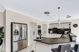 Kitchen: 5 years old, Gas cooktop, electric oven, dishwasher, black laminate benchtop